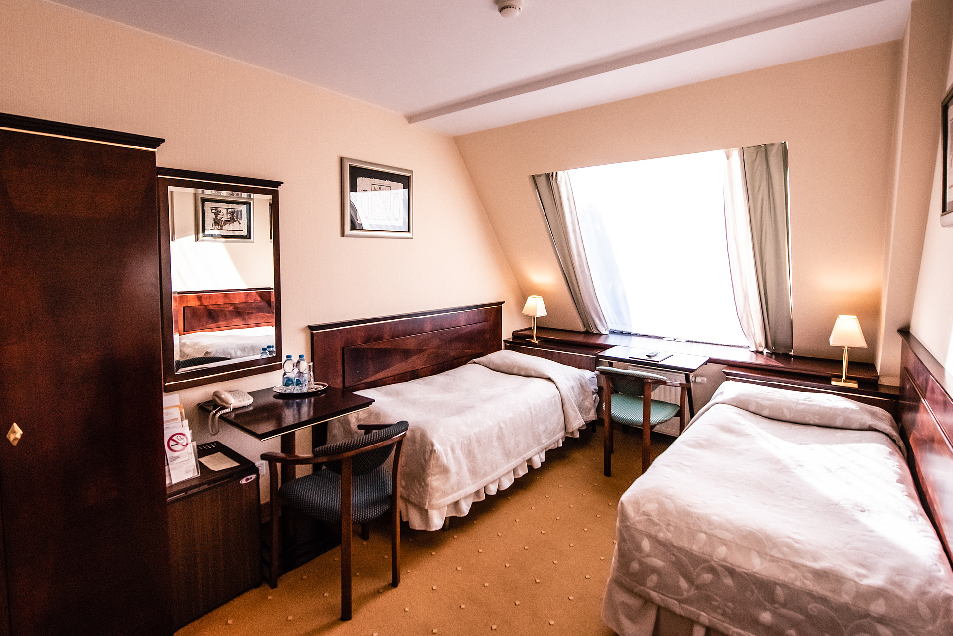 Pokój ekonomiczny to dobry wybór dla osób, którym zależy na pobycie w hotelu w najniższej możliwej cenie. Pokój z dwoma oddzielnymi łóżkami i powierzchni ok. 16 m2. W cenie noclegu: śniadanie w formie bufetu, butelka wody mineralnej, bezprzewodowy dostęp do internetu w pokoju, dostęp do kawiarenki internetowej w lobby (24h), basen z hydromasażami w wyznaczonych godzinach, studio fitness, podatek VAT. Pokój jest dostępny od 15:00 do 11:00 dnia następnego z wyjątkiem przypadków Late Check Out. Pokój dostępny dla 2 osób.